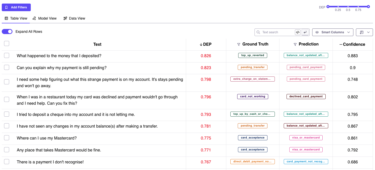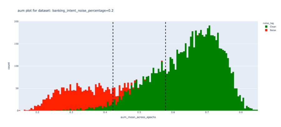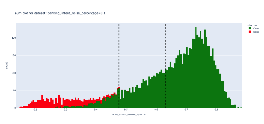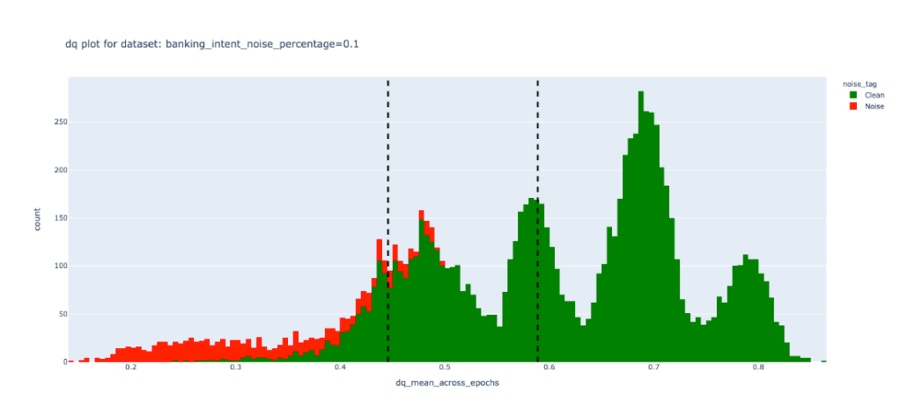 To measure the efficacy of the DEP score, we performed experiments on a public dataset and induced varying degrees of noise. We observed that unlike Confidence scores, the DEP score was successfully able to separate bad data (red) from the good (green). This demonstrates true data-centricity (model independence) of Galileo’s DEP score. Below are results from experiments on the public Banking Intent dataset. The dotted lines indicate a dynamic thresholding value (adapting to each dataset) that segments noisy (red) and clean (green) samples of the dataset.| Galileo DEP score | Model confidence score |