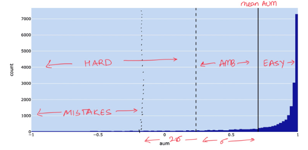 The goal is to plot AUM scores and highlight the mean AUM and mean F1 of the dataset. Two different thresholds, t_easy and t_hard, are marked as follows:- t_easy = mean AUM, so all samples above the mean AUM are considered easy.