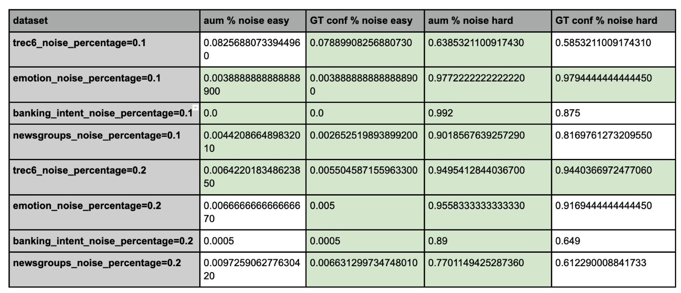 To ensure DEP calibrations follow the fundamentals of a good ML metric, it should have more noisy samples in hard section and correspondingly less noisy data in easy region. AUM outperforms prediction confidence as well as similar metrics such as Ground Truth confidence as well as Model uncertainty, in being able to surface more noisy samples in the hard category. Below are some benchmarks we calibrated on various well-known and peer reviewed datasets.