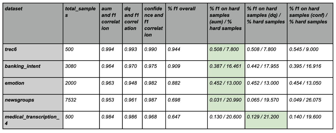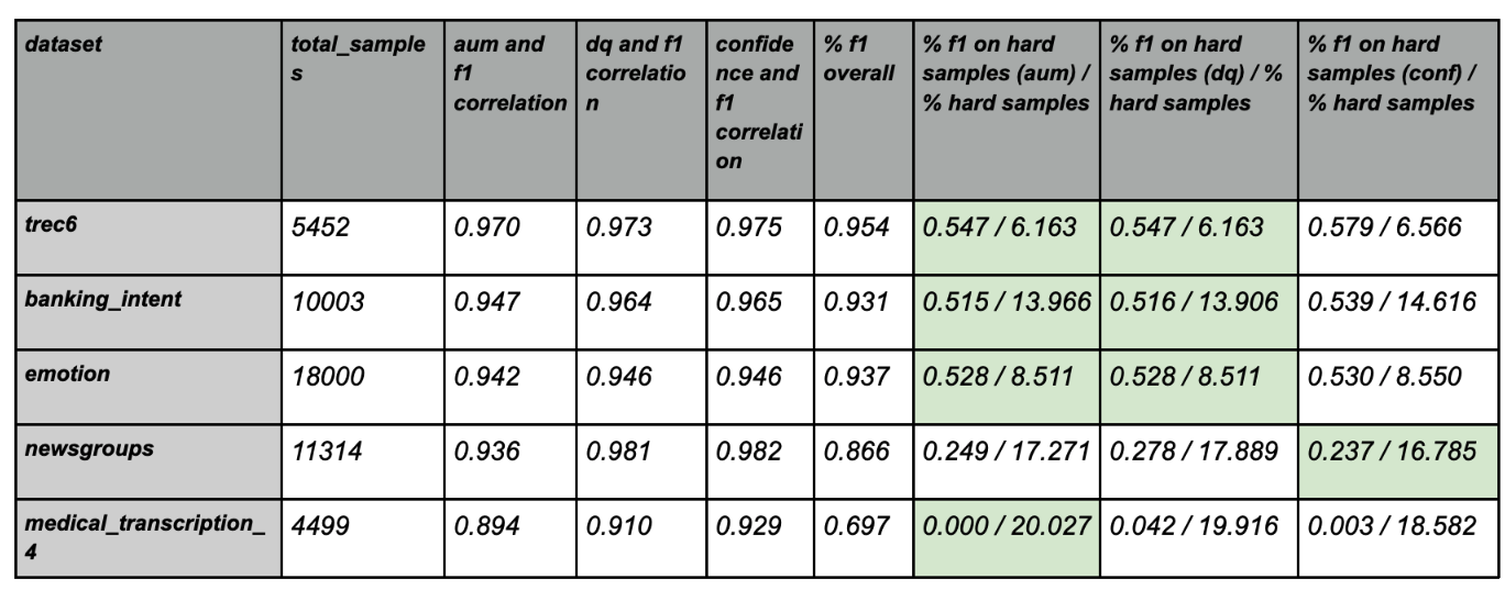 The base calculation behind the DEP score is a hybrid ‘Area Under Margin’ (AUM) mechanism. AUM is the cross-epoch average of the model uncertainty for each data sample (calculated as the difference between the ground truth confidence and the maximum confidence on a non ground truth label). AUM = p(y*) - p(ymax)y^max!=y* We then dynamically leverage K-Distinct Neighbors, IH Metrics (multiple weak learners) and Energy Functions on Logits, to clearly separate out annotator mistakes from samples that are confusing to the model or are outliers and noise. The ‘dynamic’ element comes from the fact that DEP takes into account the level of class imbalance, variability etc to cater to the nuances of each dataset.DEP score efficacy