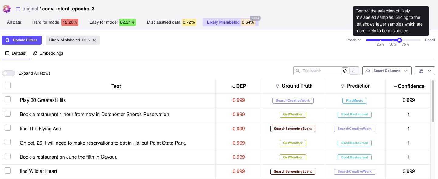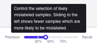 Suppose that we have a relabelling budget of only 200 samples. Start with the slider on the Recall side where the algorithm returns all the samples that are likely to be mislabeled. As you move the thumb of the slider towards the Precision side, a hovering box will appear and you should notice the number of samples decreasing, allowing you to fine-tune the algorithm for returning the 200 samples that are most likely to be mislabeled.Likely Mislabeled Computation