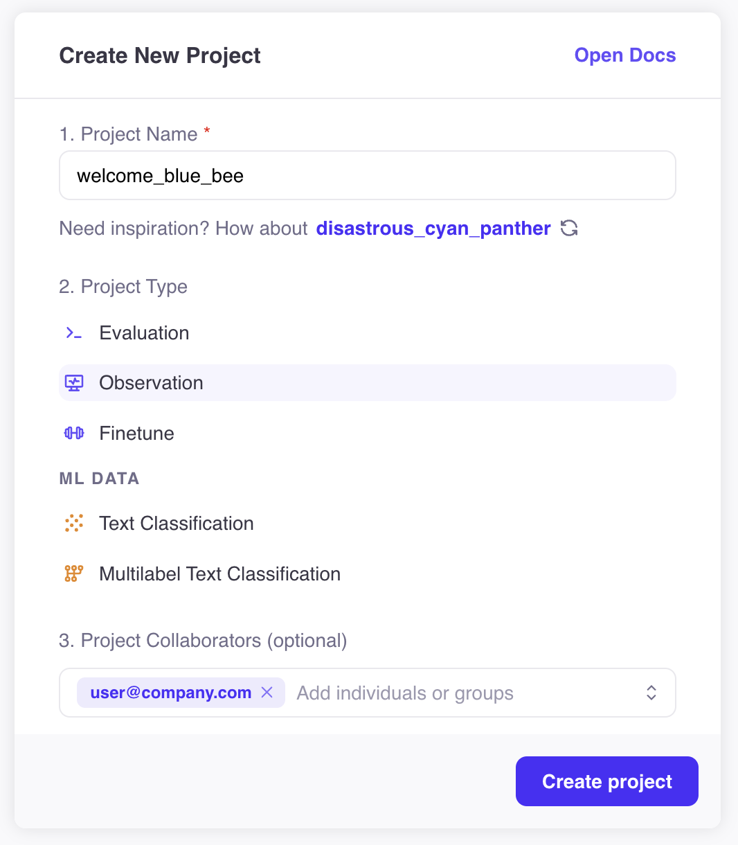 By default, only a project’s creator (and managers and admins) have access to a project. Projects can be shared both with individual users and entire groups. Together, these are called collaborators. Collaborators can be added when you create a project: