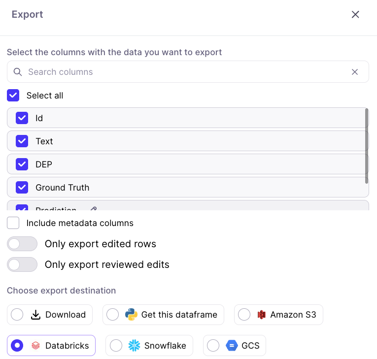 This page shows how to export data directly into Delta Lake from the Galileo UI and then reading the same data using Galileo’s Python SDK and executing a Galileo Run.Setting Up a Databricks Connection