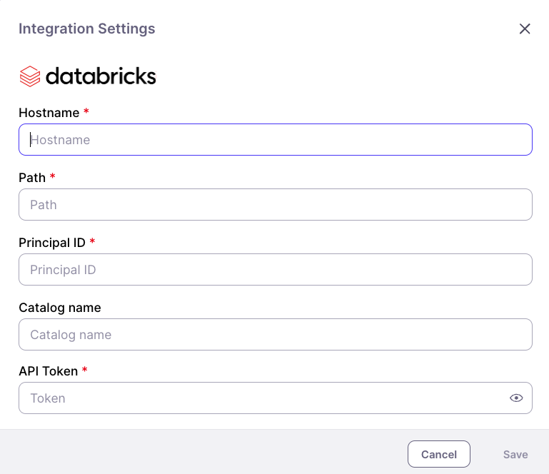 First, go to the Integrations Page and set up your Databricks connection. Setting up Databricks connection in Galileo
