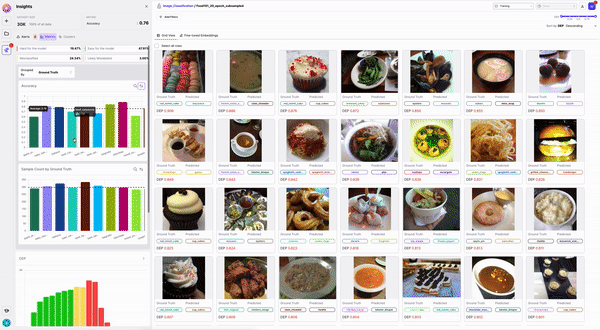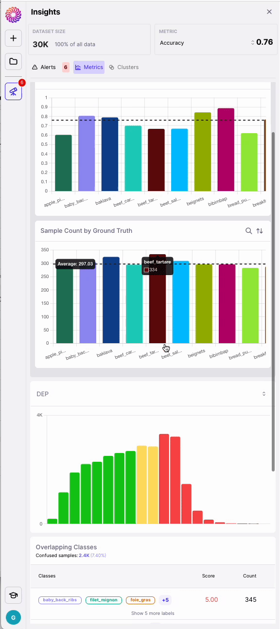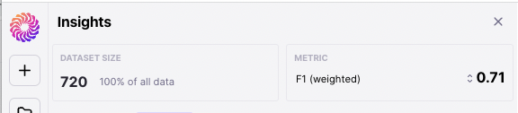 The top of the Insights Panel displays aggregate model performance (default to F1 for NLP, Accuracy, mAP and IOU for Image Classification, Object Detection or Semantic Segmentation) and allow you to select between Precision, Recall, and F1. Additionally, the Insights Panel shows the number of current data samples in scope along with what % of the total data is represented.