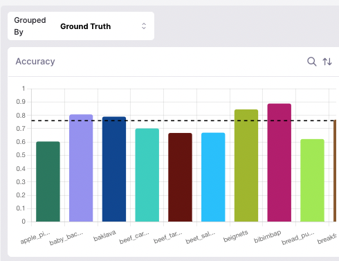 In addition to providing visual insights, each insights chart can also be interacted with. Within the “Model performance”, “Data Error Potential (DEP)”, and “Class distribution” charts selecting one of the bars restricts the data in scope to data withGold Label equal to the selected bar label.