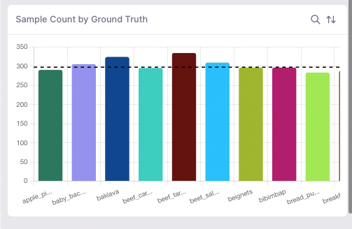 The Class Distribution chart shows the breakdown of samples within each class. This insights chart is critical for quickly drawing insights about the class makeup of the data in scope and for detecting issues with class imbalance.