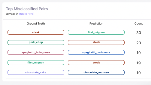 At the bottom of the Insights Panel we show the “Top five 5 most misclassified data label pairs”, where each pair shows a gold label, the incorrect prediction label, and the number of samples falling into this misclassified pairing. This insights chart provides a snapshot into the most common mistakes made by the model (i.e. mistaking ground truth label X for prediction label Y).