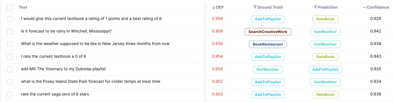 Upon completing a run, you’ll be taken to the Galileo Console. The first thing you’ll notice is your dataset on the right. On each row, we show you the sample’s text, its Ground Truth and Prediction labels, and the Data Error Potential of the sample. By default, your samples are sorted by Data Error Potential.