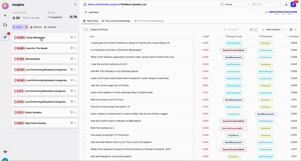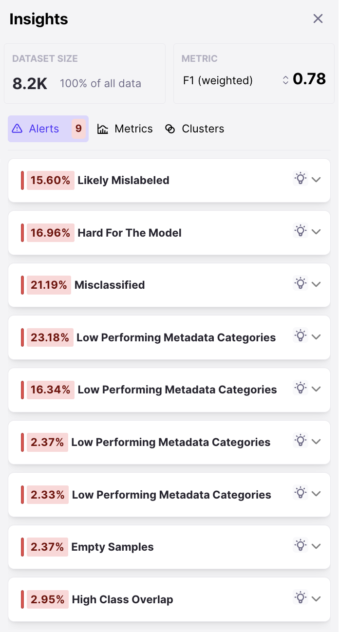 You can also view your samples in the embeddings space of the model. This can help you get a semantic understanding of your dataset. Using features like Color-By DEP, you might discover pockets of problematic data (e.g. decision boundaries that might benefit from more samples or a cluster of garbage samples). Your left pane is called the Insights Menu. On the top you can see your dataset size and choose the metric you want to guide your exploration by (F1 by default). Size and metric update as you add filters to your dataset. Your main source of insights will be Alerts, Metrics and Clusters. Alerts are a distilled list of different issues we’ve identified in your dataset. Insights such as Mislabeled Samples, Class Imbalance, Overlapping Classes, etc will be surfaced as Alerts. Clicking on an Alert will filter the dataset to the subset of data that corresponds to the Alert.