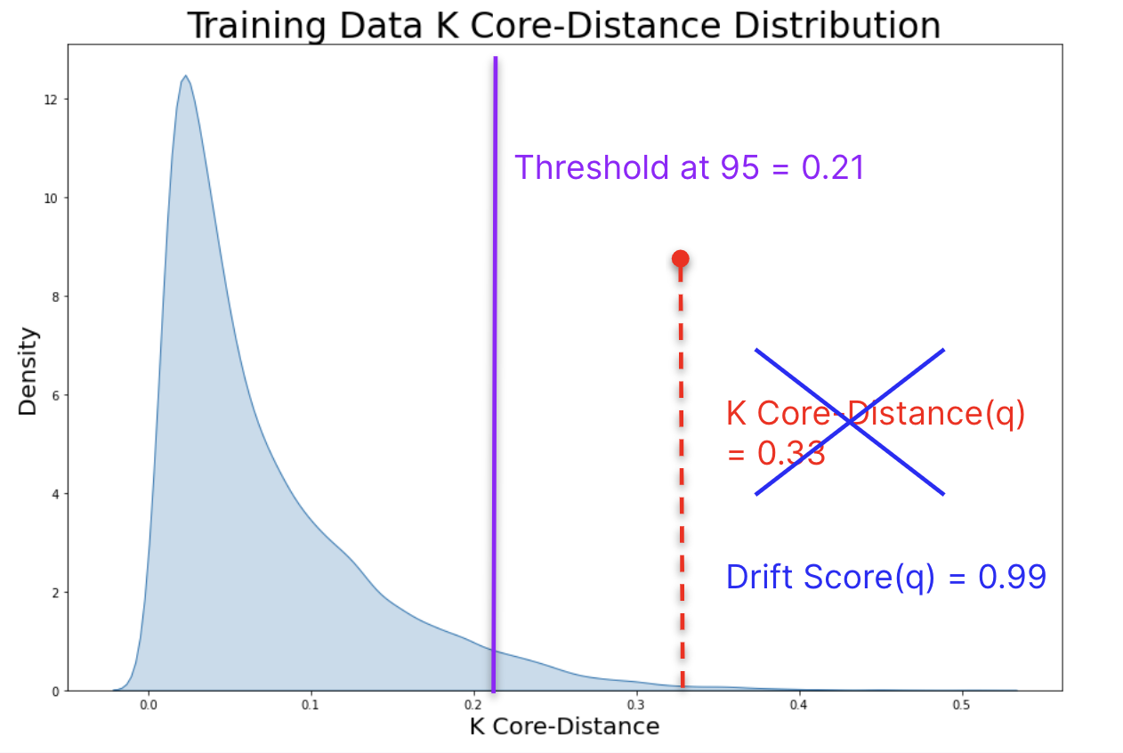 Drift / Out of Coverage Score - The percentile a sample falls in with respect to the reference K Core-Distance distribution.Unlike analyzing K Core-Distances directly, our drift / out of coverage score is fully dataset agnostic. For example, consider the example from above. With a K Core-Distance of 0.33 and a threshold of 0.21, we considered the q as drifted. However, in general 0.33 has very little meaning without the context. In comparison, a drift_score of 0.99 captures the necessary distributional context - indicating that q falls within the 99th percentile of the reference distribution and is very likely to be out of distribution.