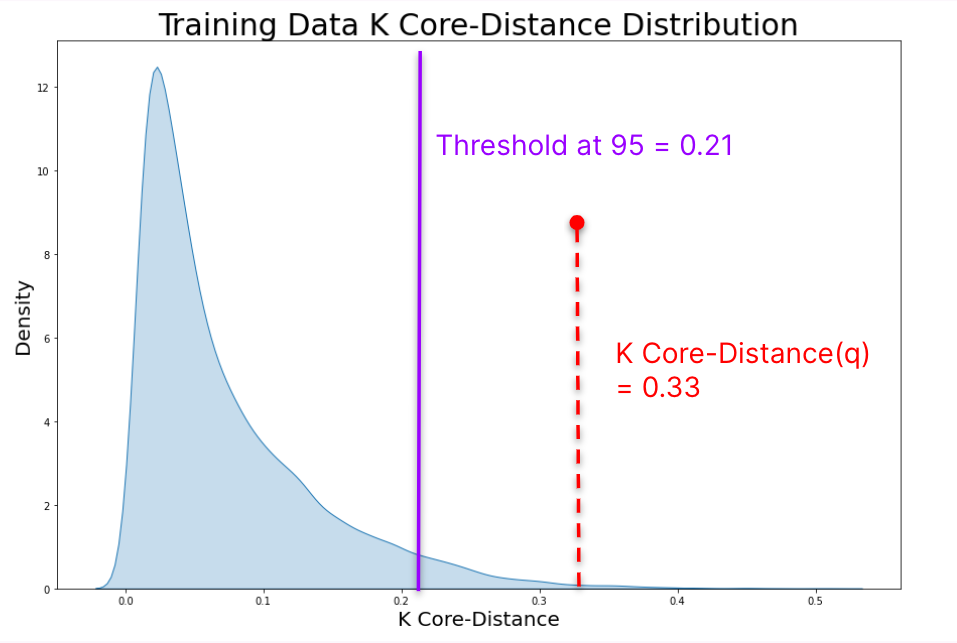 After mapping the reference distribution, we must decide a threshold above which new data should be considered OOD. Selecting a threshold based on the K Core-Distance directly is not generalizable for 2 primary reasons: 1) **** Each dataset has a unique and different K Core-Distance distribution, which in tern influences reason 2) cosine distance is not easily interpretable without context - i.e. a cosine distance of 0.6 has different meanings given two different datasets. For these reasons, we determine a threshold as a threshold at x% precision.e.g. Threshold at 95% precision - The K Core-Distance representing the 95th percentile of the reference distribution