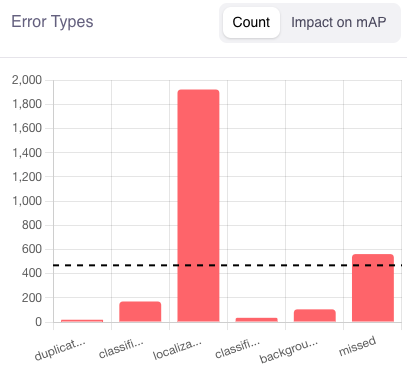 In the Galileo Console, we surface two metrics for each of the 6 error types: their count and their impact on mAP. The count is simply the number of boxes tagged with that error type, and the impact on mAP is the amount by which mAP would increase if we were to fix all errors of that type.