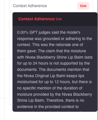 Context Adherence measures whether your model’s response was purely based on the context provided, i.e. the response didn’t state any facts not contained in the context provided. For RAG users, Context Adherence is a measurement of hallucinations. If a response is grounded in the context (i.e. it has a value of 1 or close to 1), it only contains information given in the context. If a response is not grounded (i.e. it has a value of 0 or close to 0), it’s likely to contain facts not included in the context provided to the model.
