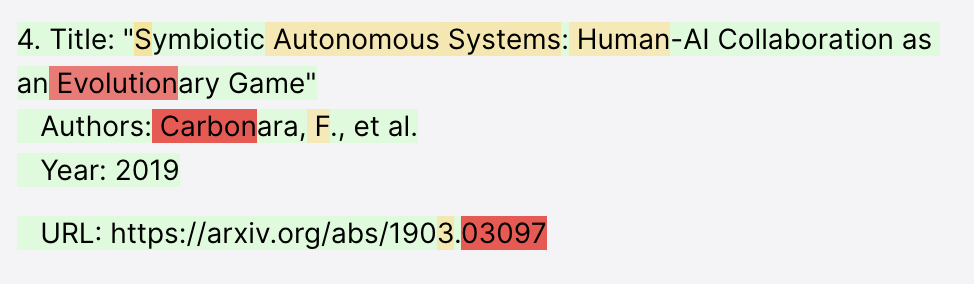 Uncertainty measures the model’s certainty in its generated tokens. Because uncertainty works at the token level, it can be a great way of identifying where in the response the model started hallucinating. When prompted for citations of papers on the phenomenon of “Human & AI collaboration”, OpenAI’s ChatGPT responds with this: