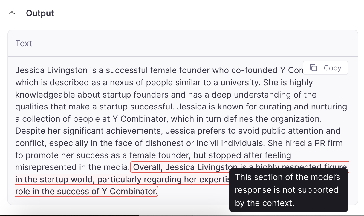 The Luna model identifies which parts of the response are not adhering to the context provided. These sections can be highlighted in the response by clicking on the icon next to the Context Adherence metric value in LLM or Chat nodes.