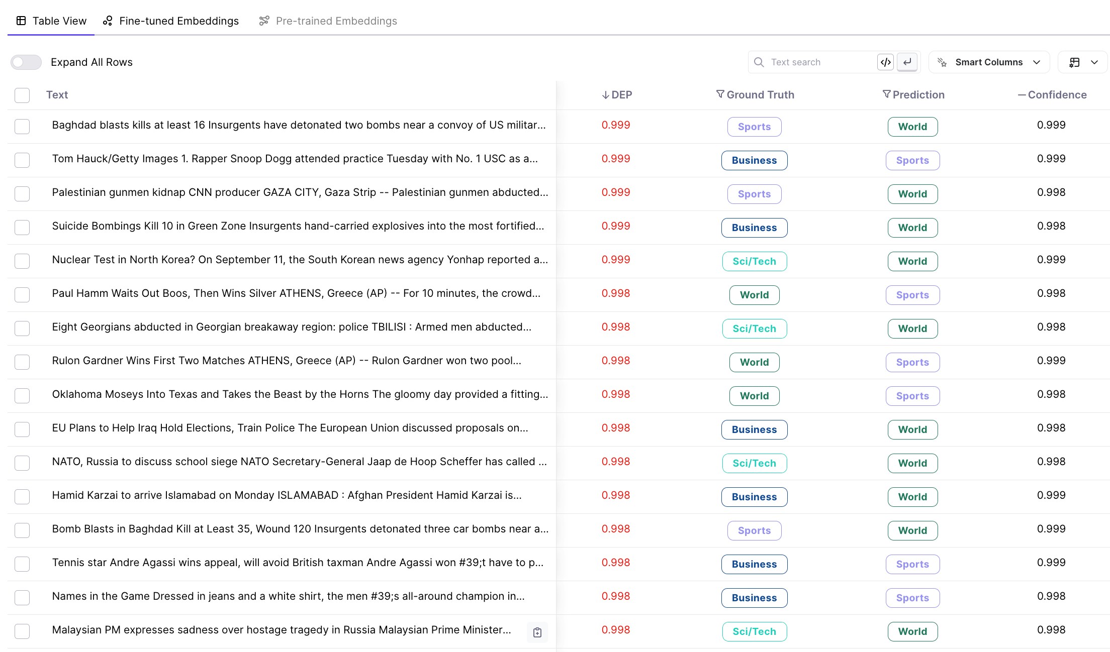 Individual data samples from your dataset or selected data subset are shown, where each sample is a row in the table. In addition to the text, a sample’s associated gold label, predicted label, and DEP score are included as data attribute columns. By default, the samples are sorted by decreasing DEP score.