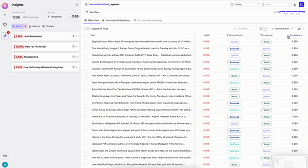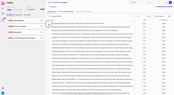 Each row or data sample can be selected to perform an action. As demonstrated in Test Drive Galileo - Movie Reviews, we can easily identify and export data samples with annotation errors for relabeling and/or further inspection. See Actions for more details.